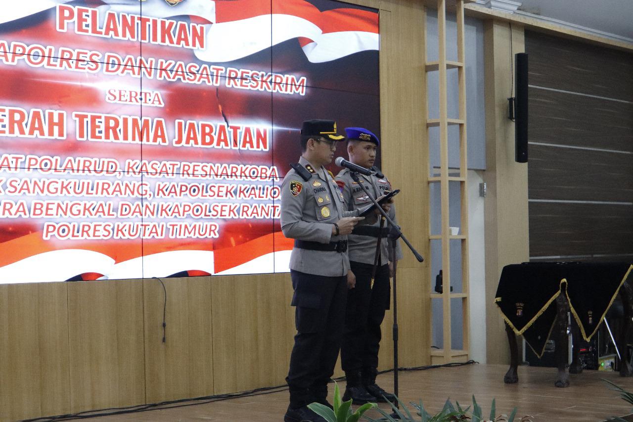 Pergantian jabatan meliputi Wakapolres, Kasat Reskrim, Kasat Resnarkoba, serta Kapolsek di beberapa wilayah, seperti Sangkulirang, Kaliorang, Muara Bengkal, dan Rantau Pulung. Dalam sambutannya, AKBP Chandra menekankan pentingnya kesinambungan program kerja serta komitmen para pejabat baru dalam menjaga keamanan dan ketertiban.
