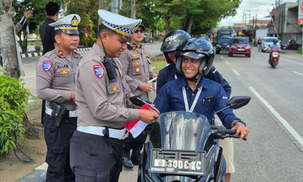 jurnalmahakam.com, Tenggarong – Menyambut Hari Ulang Tahun (HUT) ke-80 Kemerdekaan Republik Indonesia, Kepolisian Resor Kutai Kartanegara (Polres Kukar) melaksanakan kegiatan simpatik dengan membagikan bendera Merah Putih dan bunga kepada masyarakat pengguna jalan. Aksi tersebut berlangsung pada Selasa (5/8/2025) sekitar pukul 13.20 Wita di Simpang 4 lampu merah Jalan KH. Ahmad Muksin, Kelurahan Timbau, Kecamatan Tenggarong.