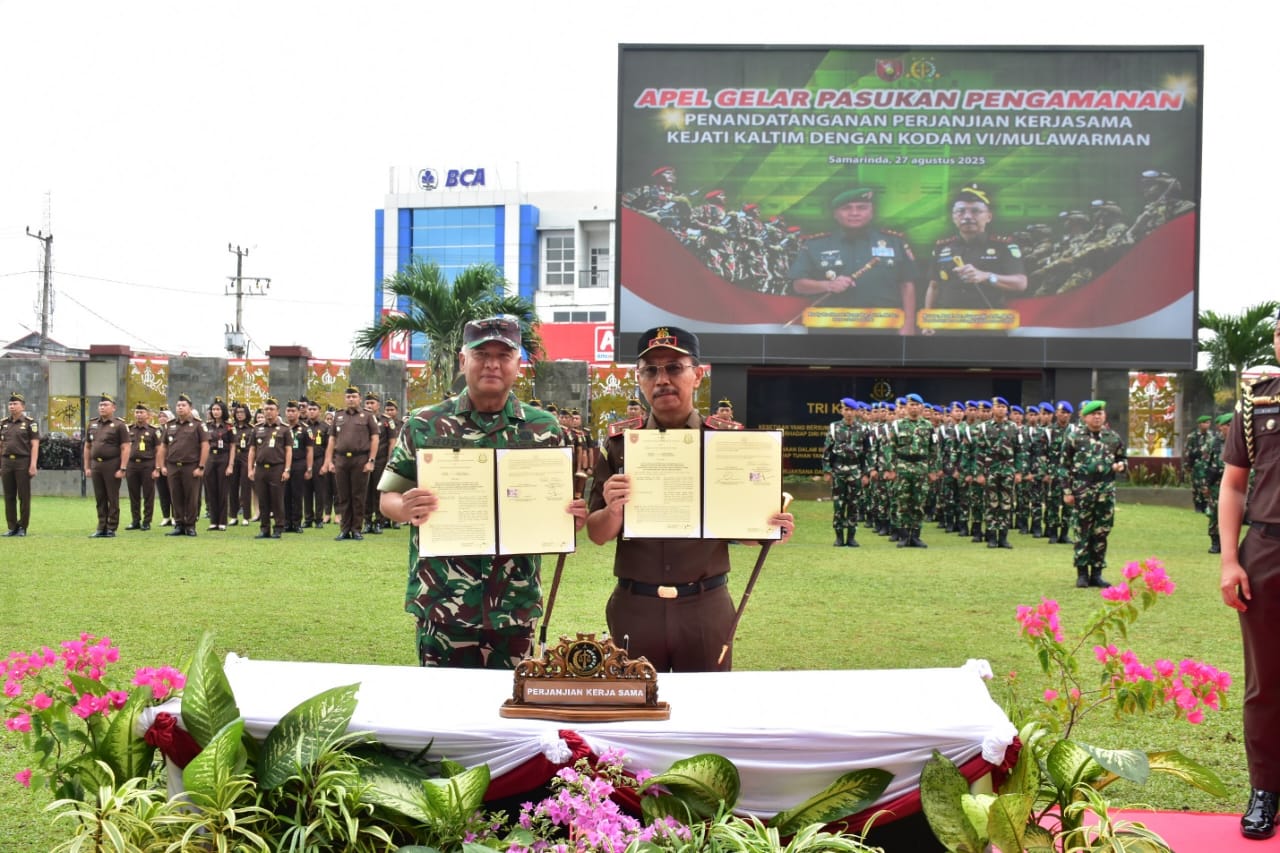 jurnalmahakam.com, SAMARINDA – Kejaksaan Tinggi (Kejati) Kalimantan Timur (Kaltim) bersama Komando Daerah Militer (Kodam) VI/Mulawarman melaksanakan apel gelar pasukan pengamanan sekaligus penandatanganan perjanjian kerja sama di halaman Kantor Kejati Kaltim, Jalan Bung Tomo, Samarinda Seberang, pada Rabu (27/8/2025).
