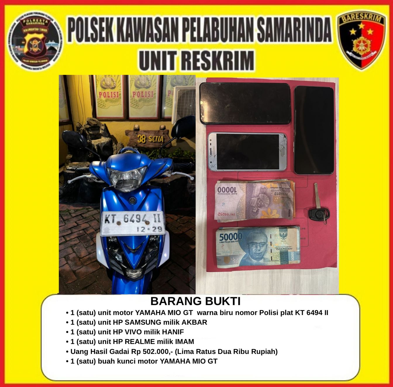 Selain motor, aparat kepolisian juga menyita sejumlah barang bukti berupa tiga unit ponsel, uang tunai Rp502 ribu yang merupakan hasil gadai, serta kunci motor. Seluruh barang bukti tersebut diamankan guna memperkuat proses hukum yang sedang berjalan.
