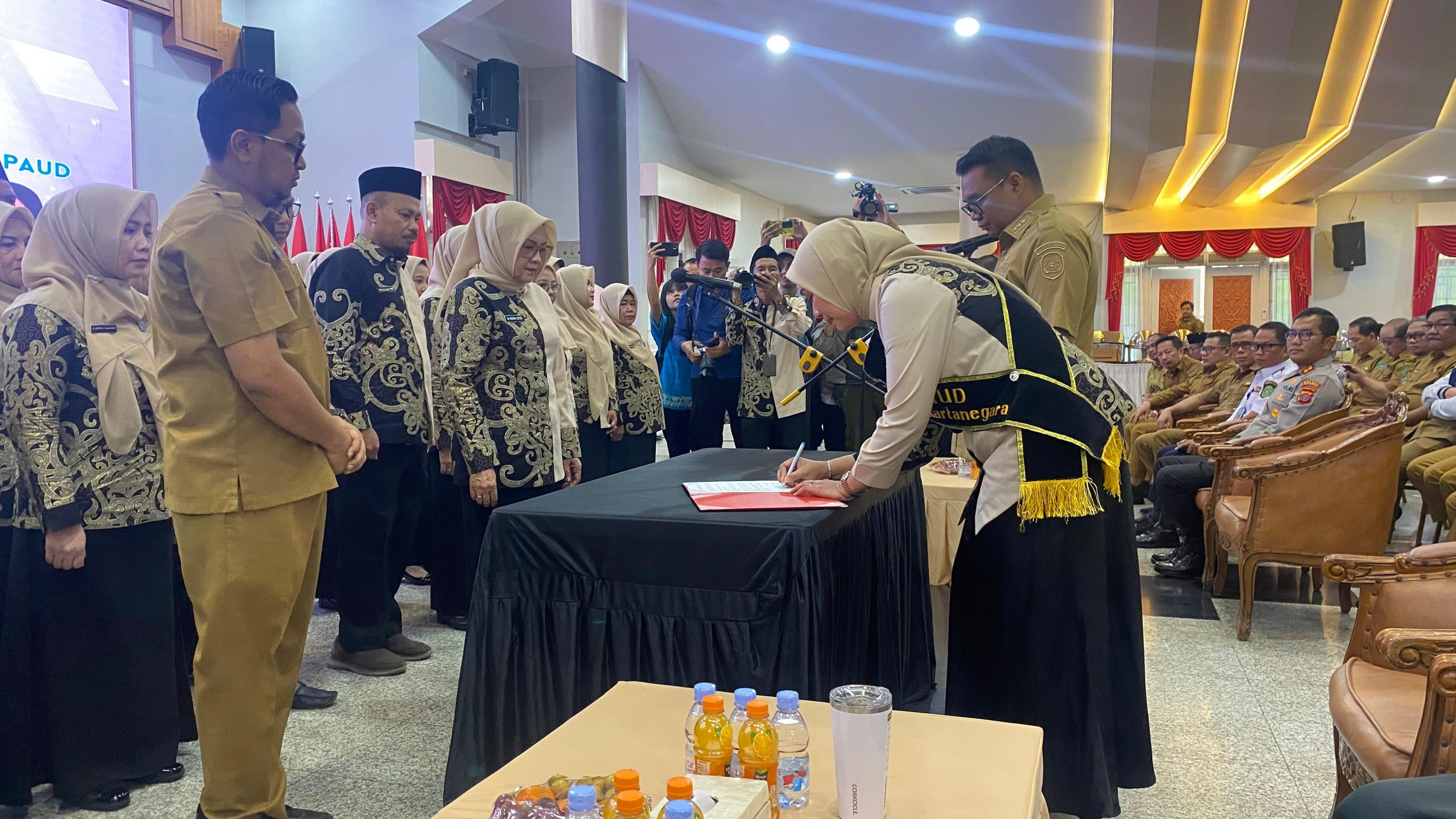 Prosesi pelantikan berjalan dengan khidmat. Dimulai dengan pembacaan Surat Keputusan Bupati, kemudian penyematan pin oleh Bunda PAUD Kukar kepada pengurus baru, dilanjutkan dengan pembacaan ikrar, dan ditutup dengan penandatanganan kerja sama. Seluruh jajaran OPD yang hadir turut menandatangani komitmen bersama dalam mendukung program PAUD yang bermutu.